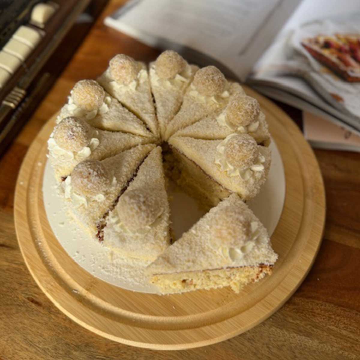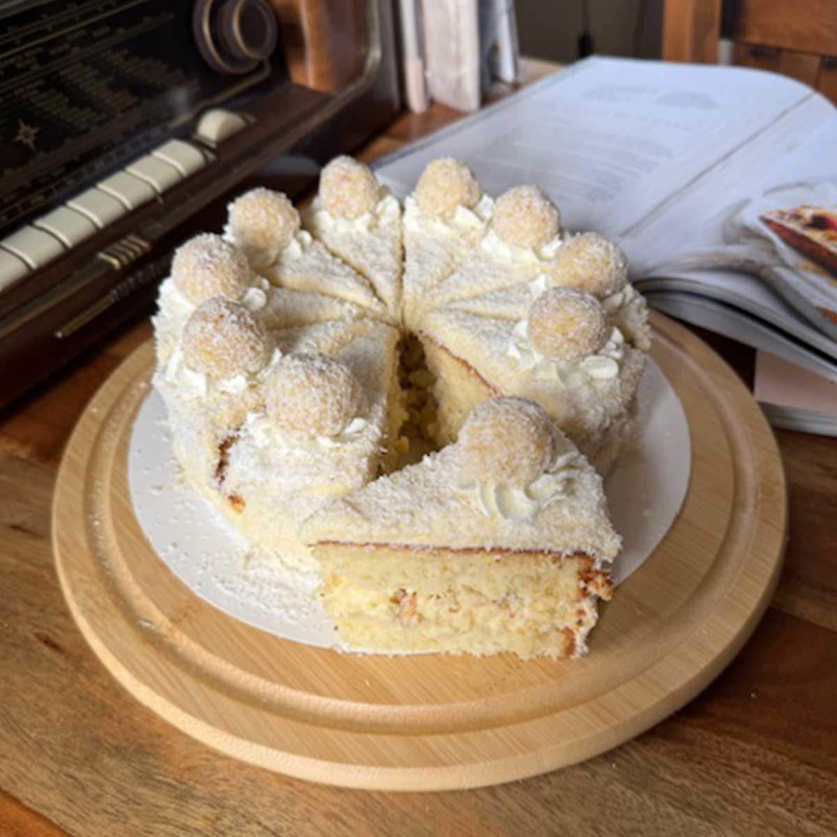 De taart is rijkelijk afgewerkt met kokosrasp en knapperige stukjes amandel, wat zorgt voor een heerlijke combinatie van zoet, romig en licht tropisch. Perfect voor liefhebbers van kokos en witte chocolade.