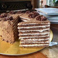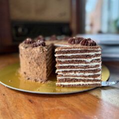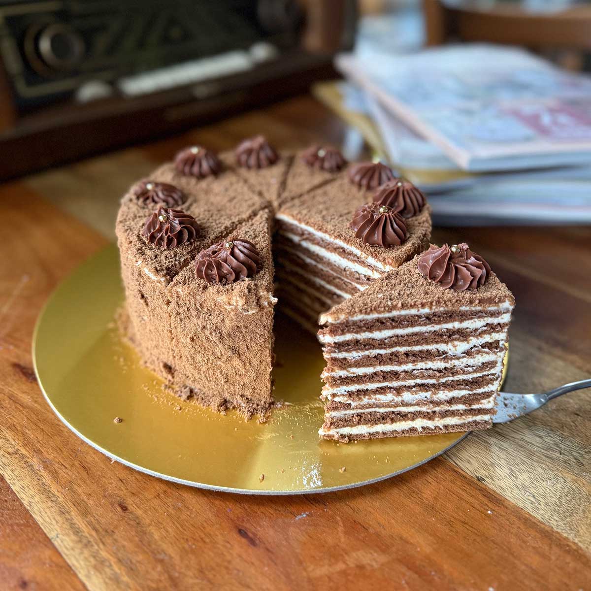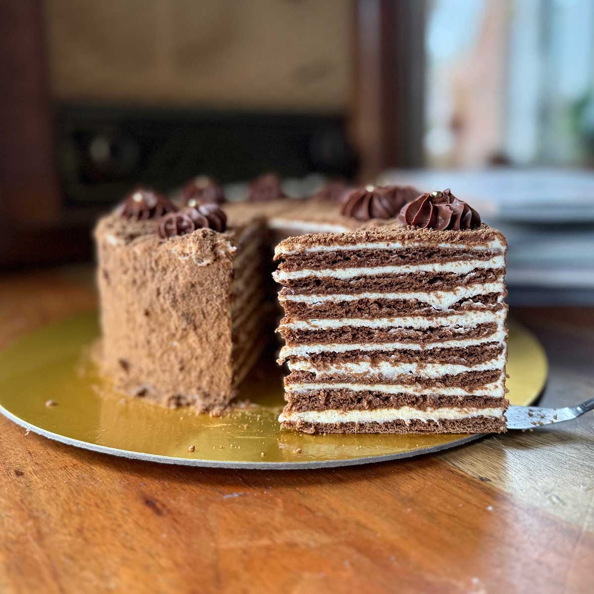 Heerlijke, klassieke taart bestaande uit luchtige lagen honing- en chocoladebiscuit, doordrenkt met plombliercrème.